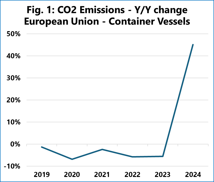 根据欧盟监测、报告和核查(MRV)法规下的强制性欧盟排放数据,红海持续的危机和非洲南部船只的改道,导致欧盟集装箱航运的二氧化碳排放量在2024年惊人地增加了45%。