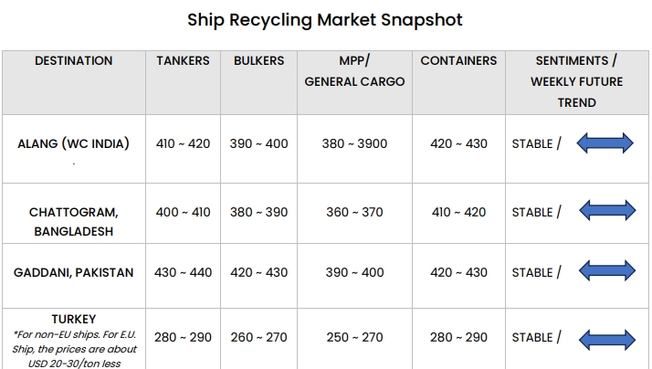 加达尼的船舶回收市场继续提供最具竞争力的价格,回收商支付溢价购买可回收船只。这种激增是由地方当局批准的临时延期推动的,允许船厂购进船只,同时向船级社展示在香港公约(HKC)认证方面取得的进展。到目前为止,大约有七家船厂取得了实质性进展,据报道,它们接近完全符合香港标准。市场情绪总体保持稳定,需求保持坚挺。