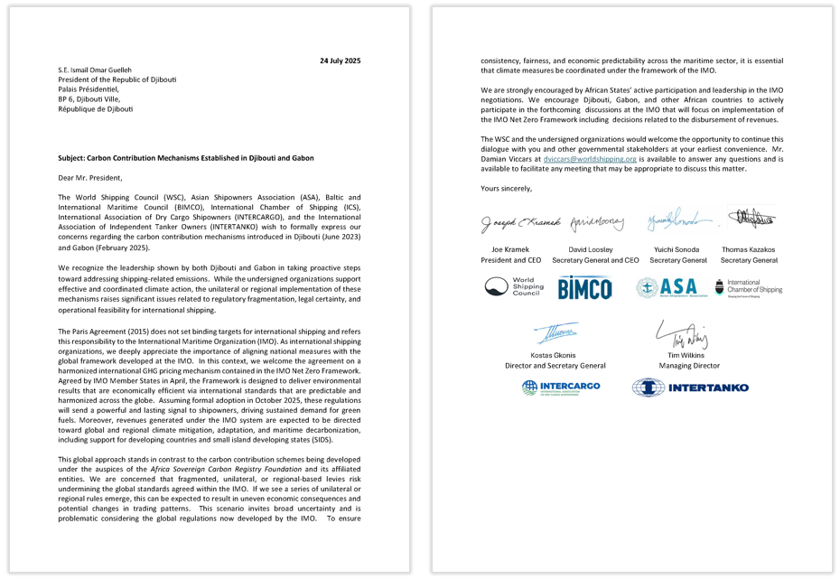 近日,世界航运理事会(WSC)、波罗的海国际航运公会(BIMCO)、亚洲船东协会(ASA)、国际航运公会(ICS)、国际干散货船东协会(INTERCARGO)以及国际独立油轮船东协会(INTERTANKO)六大国际航运协会,联名致信吉布提总统伊斯梅尔·奥马尔·盖莱(Ismail Omar Guelleh)和加蓬总统布里斯·奥利吉·恩圭马(Brice Oligui Nguema),对其主导的“碳贡献机制”表示严重关切,并呼吁将相关政策回归国际海事组织(IMO)统一框架内讨论和实施。