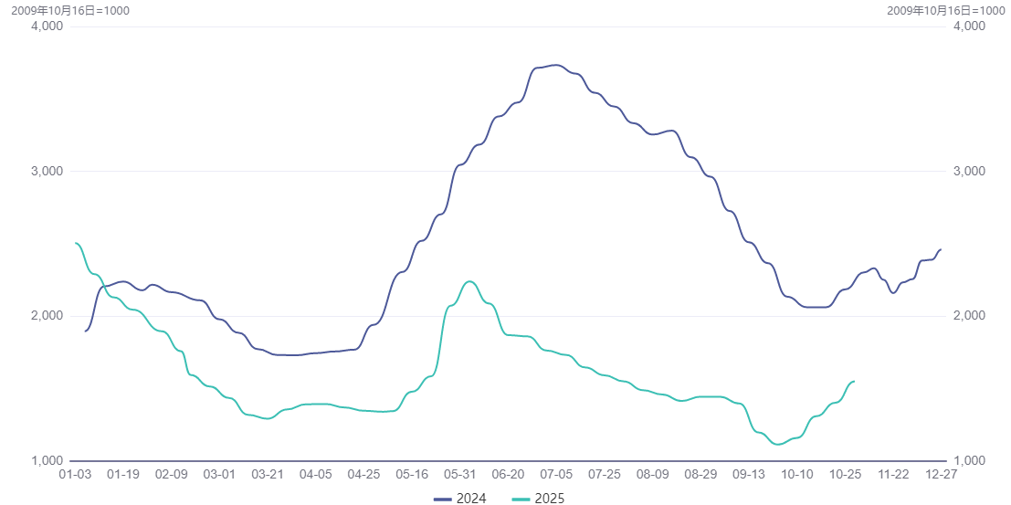 图2 上海出口集装箱运价指数综合指数(SCFI)(2024年01月-2025年10月)