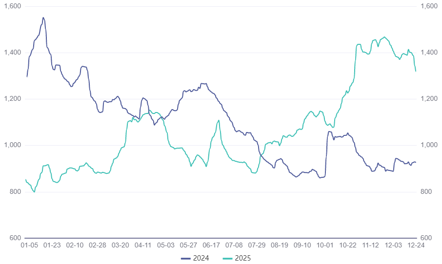 2025年12月24日,波罗的海原油运费指数(Baltic Exchange Dirty Tanker Index)收于1319点(图1),全年最小值799点,最大值1468点,中位数1019点,平均值1069.48点。相比2024年波罗的海原油运费指数中位数1108