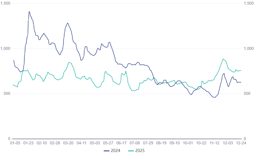 2025年12月24日,波罗的海成品油运费指数(Baltic Exchange Clean Tanker Index)收于757点(图2),全年最小值534点,最大值885点,中位数656点,平均值667.33点。相比2024年波罗的海成品油运费指数中位数819点(下降19.90%),平均值818.02点(下降18.42%);相比近5年(2020-2024年)波罗的海原油运费指数中位数686点(下降4.37%),平均值791.01点(下降15.64%)。