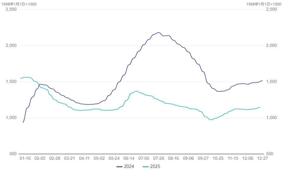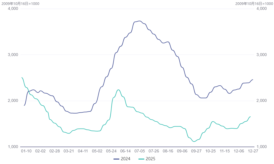 图2 上海出口集装箱运价指数综合指数(SCFI)(2024年01月-2025年12月)