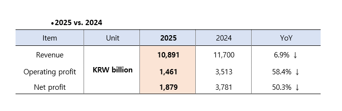 根据HMM 2月11日公布的2025年业绩,全年收入为108,910亿韩元(约合75.46亿美元),同比下降6.9%;净利润为18,790亿韩元(约合13.02亿美元),同比大跌50.3%。