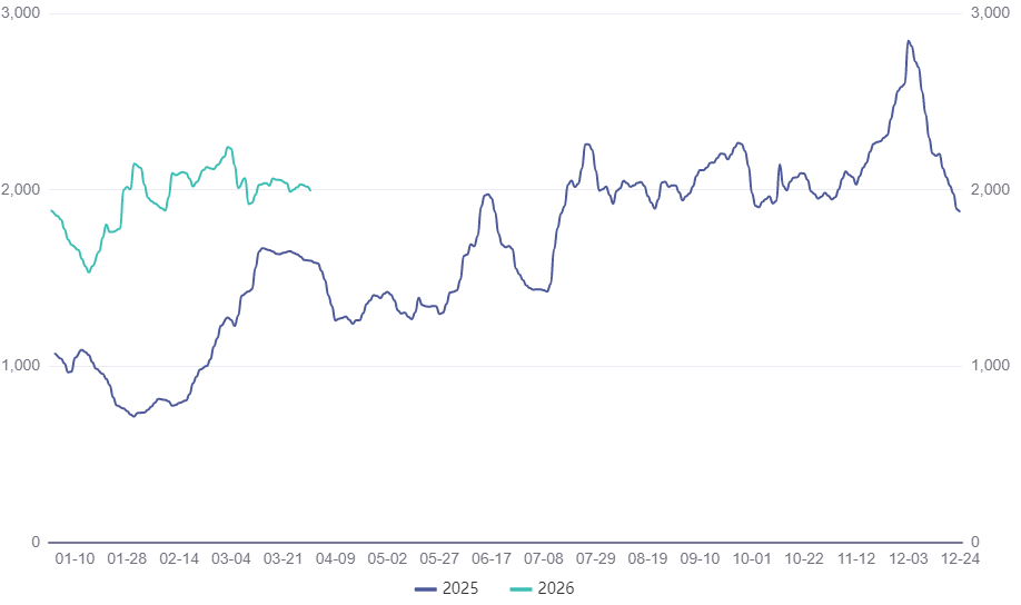 2026年03月31日,波罗的海干散货运费指数(Baltic Exchange Dry Index)收于1995点(图1),全年最小值1532点,最大值22428点,中位数2012点,平均值1956.56点。相比2025年波罗的海干散货运费指数中位数1691点(上升18.98%),平均值1638.58点(上升19.41%);相比近5年(2021-2025年)波罗的海干散货运费指数中位数1816.50点(上升10.76%),平均值1939.04点(上升0.90%)。