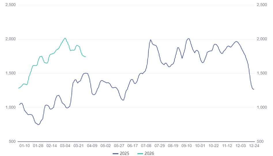 2026年03月31日,波罗的海巴拿马型运费指数(Baltic Exchange Panamax Index)收于1744点(图2),全年最小值1293点,最大值2014点,中位数1761点,平均值1717.45点。相比2025年波罗的海巴拿马型运费指数中位数1492点(上升18.03%),平均值1486.44点(上升15.54%);相比近5年(2021-2025年)波罗的海巴拿马型运费指数中位数1718.50点(上升2.47%),平均值1953.78点(下降12.10%)。