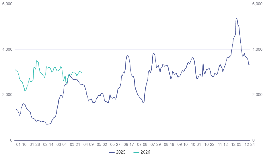 2026年03月31日,波罗的海好望角型运费指数(Baltic Exchange Capesize Index)收于2947点(图3),全年最小值2175点,最大值3507点,中位数2951点,平均值2908.19点。相比2025年波罗的海好望角型运费指数中位数2786点(上升5.92%),平均值2573.23点(上升13.02%);相比近5年(2021-2025年)波罗的海好望角型运费指数中位数2436.50点(上升21.12%),平均值2650.55点(上升9.72%)。