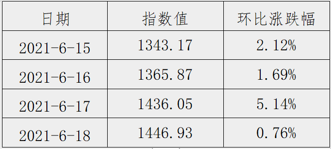 2021年第25周(6月15日-18日),北方国际干散货运价指数(TBI)本周共发布4次,走势如下图所示。