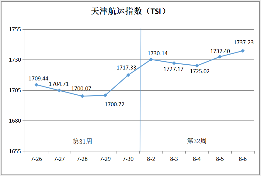 上图为天津航运指数(TSI)自2021年7月26日至8月6日走势图,2021年第32周TSI指数值如下表: