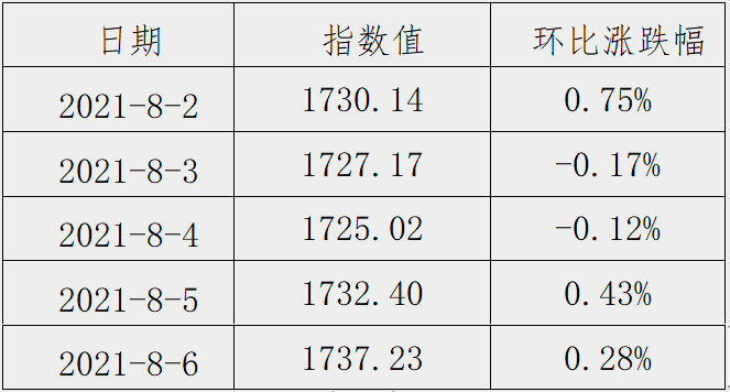 2021年第32周(8月2日-6日),天津航运指数波动攀升,8月6日指数值收于1737.23点,相比7月30日(第31周最后一个发布日)累计上涨1.16%,走势如下图所示。