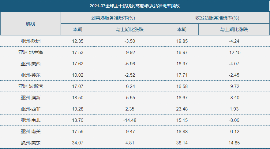 全球主干航线到离港/收发货准班率指数