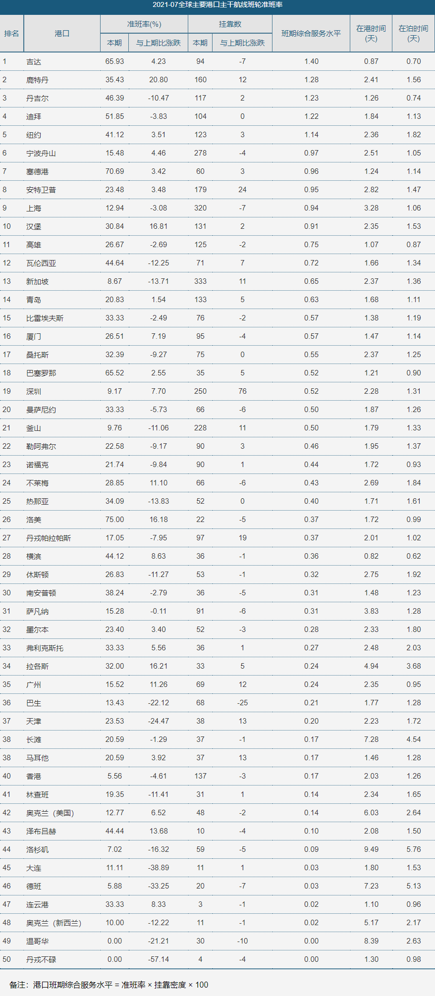 全球主干航线到离港/收发货准班率指数 全球主要港口主干航线班轮准班率
