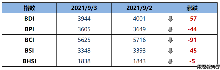 波罗的海干散货运价指数(BDI)上周五下跌57点,或环比下降1.42%至3944点。波罗的海好望角型散货船运价指数(BCI)下降91点,或环比下降1.59%至5625点。波罗的海巴拿马型散货船运价指数(BPI)下降44点,或环比下降1.21%至3605点。波罗的海超灵便型散货船运价指数(BSI)下降45点,或环比下降1.33%至3348点。波罗的海灵便型散货船运价指数(BHSI)下降5点,或环比下降0.27%至1838点。