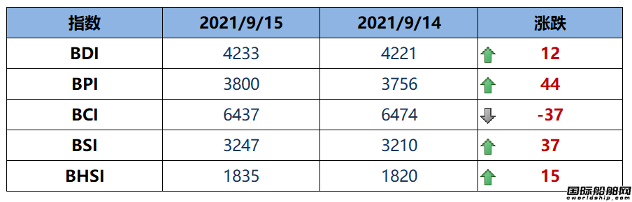 波罗的海干散货运价指数(BDI)周三上升12点,或环比上升0.28%至4233点。波罗的海好望角型散货船运价指数(BCI)下降37点,或环比下降0.57%至6437点。波罗的海巴拿马型散货船运价指数(BPI)上升44点,或环比上升1.17%至3800点。波罗的海超灵便型散货船运价指数(BSI)上升37点,或环比上升1.15%至3247点。波罗的海灵便型散货船运价指数(BHSI)上升15点,或环比上升0.82%至1835点。