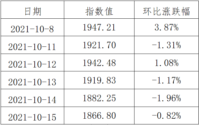 2021年第41-42周(10月8日-15日),北方国际干散货运价指数(TBI)发布6次,走势如下图所示: