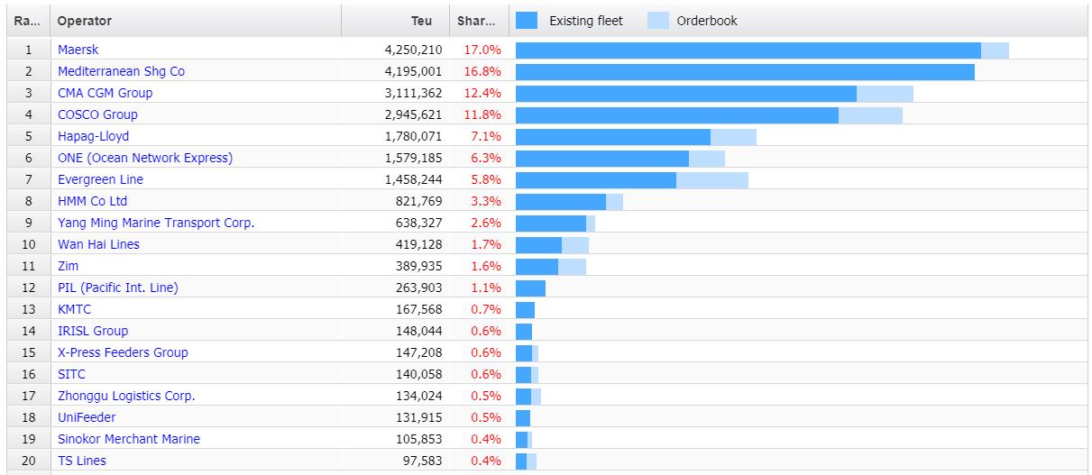 第四名到第十名依次为:中远海运集团、赫伯罗特、ONE、长荣、现代商船、阳明海运和万海航运。