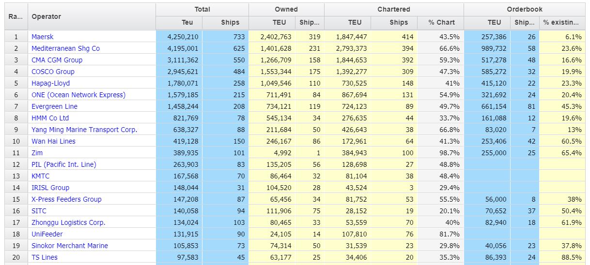 Alphaliner最新运力数据显示,截至2021年10月29日,全球班轮公司运力100强中排名前三的是马士基航运、地中海航运、达飞集团。前三大班轮公司的总运力占到了市场的46.2%。全球总营运班轮船舶为6,287艘、25,186,618 TEU折合302,157,447 DWT。