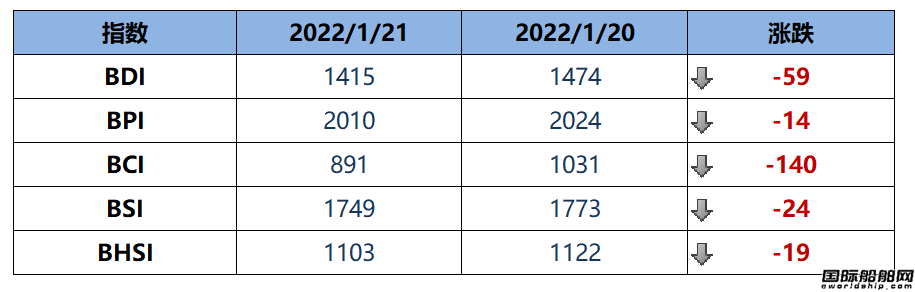 波罗的海干散货运价指数(BDI)上周五下跌59点,或环比下降4.00%至1415点。波罗的海好望角型散货船运价指数(BCI)下降140点,或环比下降13.58%至891点。波罗的海巴拿马型散货船运价指数(BPI)下降14点,或环比下降0.69%至2010点。波罗的海超灵便型散货船运价指数(BSI)下降24点,或环比下降1.35%至1749点。波罗的海灵便型散货船运价指数(BHSI)下降19点,或环比下降1.69%至1103点。