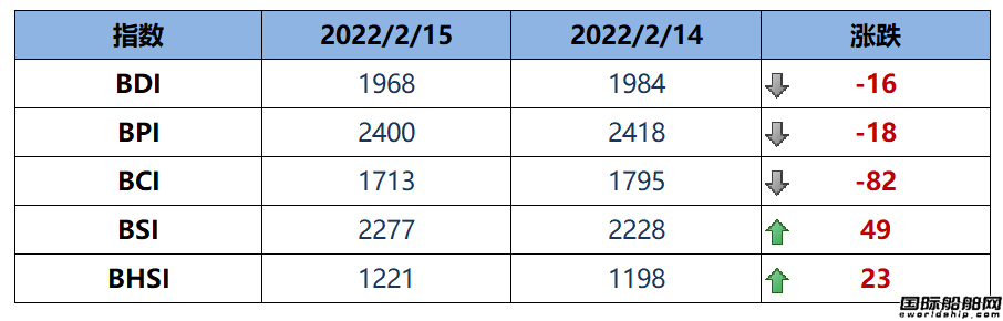 波罗的海干散货运价指数(BDI)周二下跌16点,或环比下降0.81%至1968点。波罗的海好望角型散货船运价指数(BCI)下降82点,或环比下降4.57%至1713点。波罗的海巴拿马型散货船运价指数(BPI)下降18点,或环比下降0.74%至2400点。波罗的海超灵便型散货船运价指数(BSI)上升49点,或环比上升2.20%至2277点。波罗的海灵便型散货船运价指数(BHSI)上升23点,或环比上升1.92%至1221点。