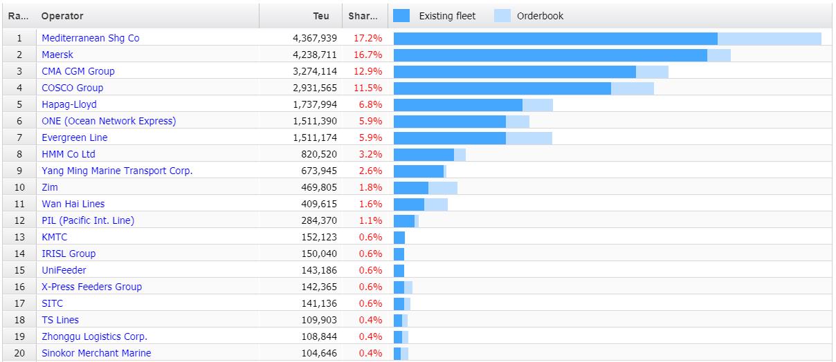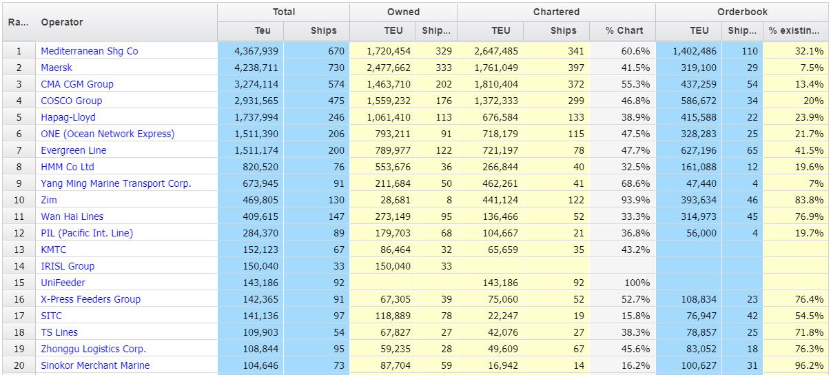 全球班轮公司运力排名TOP-20(截至2022年05月13日)