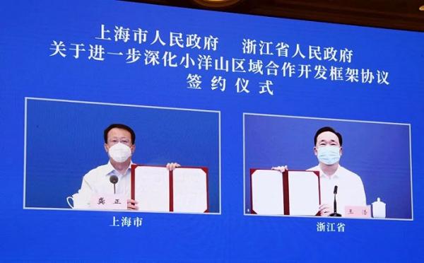 6月15日,上海市人民政府与浙江省人民政府以视频连线方式正式签署进一步深化小洋山区域合作开发框架协议。上海市委书记李强、浙江省委书记袁家军和交通运输部部长李小鹏、国家发展改革委副主任胡祖才出席签约活动并讲话。上海市委副书记、市长龚正,浙江省委副书记、省长王浩共同签署协议。
