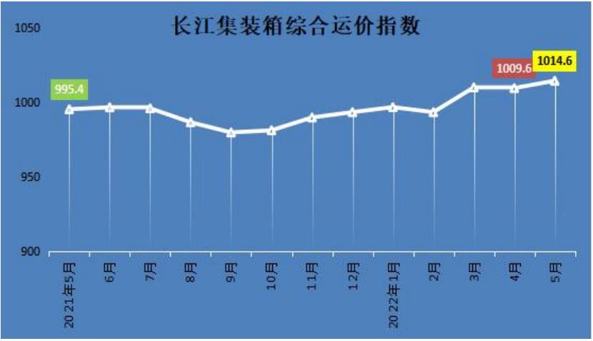 2022年5月,长江集装箱综合运价指数为1014.6,环比上升0.5%。其中,长江上游、中游、下游区域运价指数均环比上升。