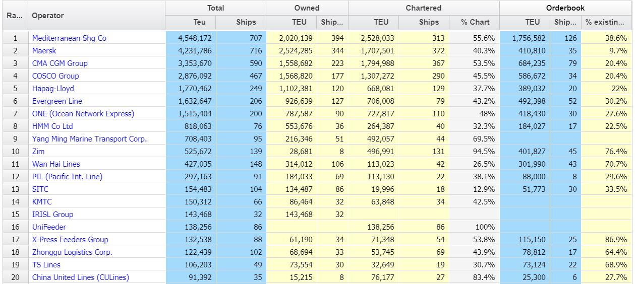 第四名到第十名依次为:中远海运集团、赫伯罗特、长荣、ONE、现代商船、阳明海运和以星航运。