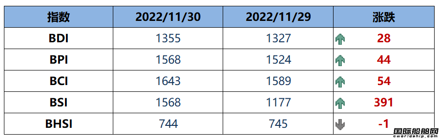 波罗的海干散货运价指数(BDI)周三上升28点,或环比上升2.11%至1355点。波罗的海好望角型散货船运价指数(BCI)上升54点,或环比上升3.40%至1643点。波罗的海巴拿马型散货船运价指数(BPI)上升44点,或环比上升2.89%至1568点。波罗的海超灵便型散货船运价指数(BSI)上升391点,或环比上升33.22%至1568点。波罗的海灵便型散货船运价指数(BHSI)下降1点,或环比下降0.13%至744点。