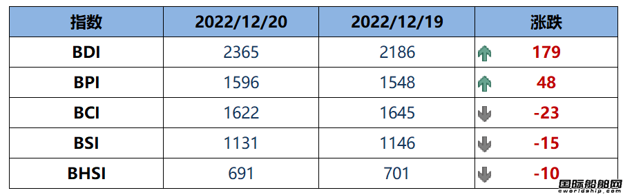 波罗的海干散货运价指数(BDI)周二上升179点,或环比上升8.19%至2365点。波罗的海好望角型散货船运价指数(BCI)下降23点,或环比下降1.40%至1622点。波罗的海巴拿马型散货船运价指数(BPI)上升48点,或环比上升3.10%至1596点。波罗的海超灵便型散货船运价指数(BSI)下降15点,或环比下降1.31%至1131点。波罗的海灵便型散货船运价指数(BHSI)下降10点,或环比下降1.43%至691点。