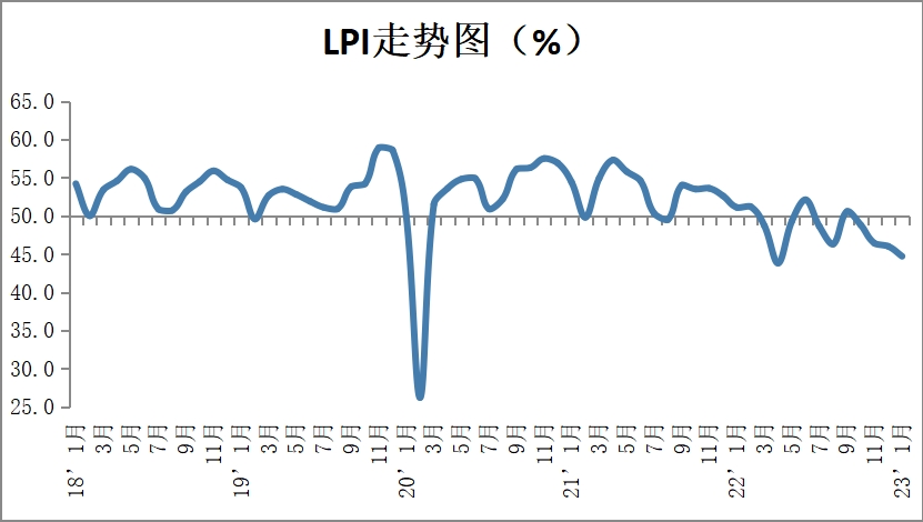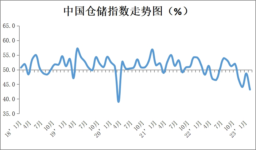 中国物流与采购联合会发布的2023年1月份中国物流业景气指数为44.7%,较上月回落1.3个百分点;中国仓储业指数为43.2%,较上月回落5.5个百分点。