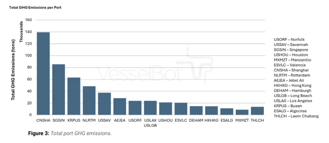 VesselBot的报告表明,虽然部分港口在绿色技术和数字化转型方面取得了进展,但全球多个港口的温室气体排放量仍呈上升趋势,尤其是在操作扩张、贸易激增以及贸易战等外部因素的推动下,港口排放问题依然严峻。