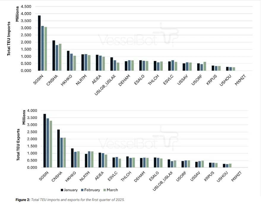 美国的港口在2025年初也经历了前所未有的货运量激增。洛杉矶和长滩港在1月经历了大量集装箱的到达,主要是由于许多企业为了应对即将实施的关税而提前发货。尽管如此,由于恶劣天气,休斯敦港在2月的活动量出现了29%的下降,造成了船舶的严重延误和排放增加。