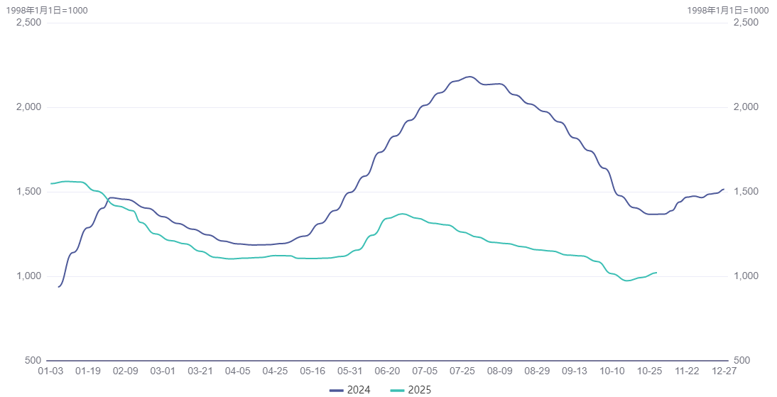 图2 上海出口集装箱运价指数综合指数(SCFI)(2024年01月-2025年10月)