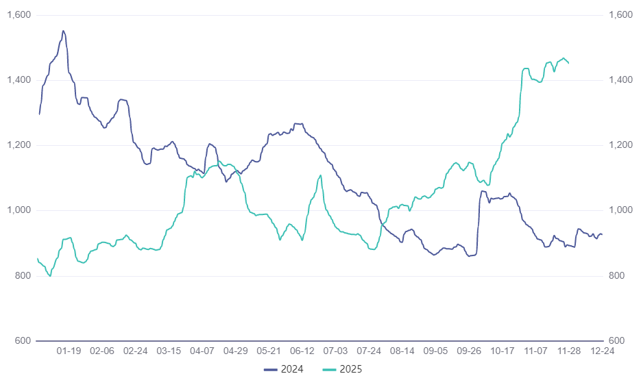 2025年11月28日,波罗的海原油运费指数(Baltic Exchange Dirty Tanker Index)收于1452点(图1),全年最小值799点,最大值1468点,中位数1007点,平均值1044.58点。相比2024年波罗的海原油运费指数中位数1108