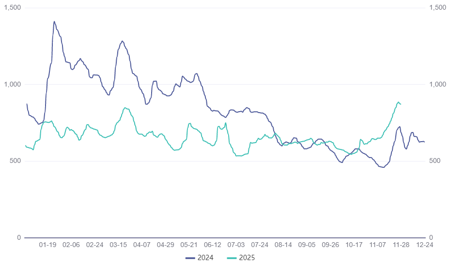 2025年11月28日,波罗的海成品油运费指数(Baltic Exchange Clean Tanker Index)收于871点(图2),全年最小值534点,最大值885点,中位数650点,平均值659.61点。相比2024年波罗的海成品油运费指数中位数819点(下降20.63%),平均值818.02点(下降19.37%);相比近5年(2020-2024年)波罗的海原油运费指数中位数686点(下降5.25%),平均值791.01点(下降16.61%)。