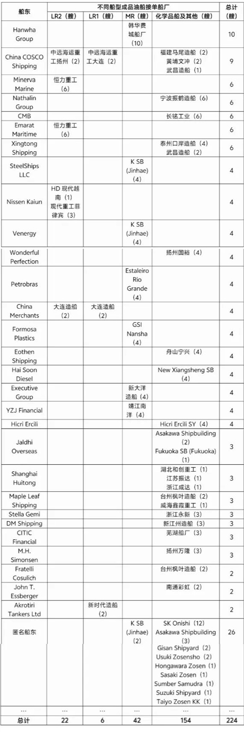 表2 2025年初至今全球成品油船主要下单船东及接单船厂(部分)