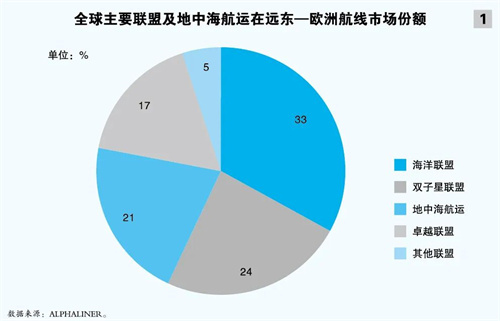 远东—欧洲航线作为全球集运业的“兵家必争之地”,联盟重组后格局并未发生实质变化,海洋联盟依然占据主导地位。根据 ALPHALINER2026年1月份发布的数据,海洋联盟在该航线的市场份额为33%,排名第二的双子星联盟仅为24%(见图1)。