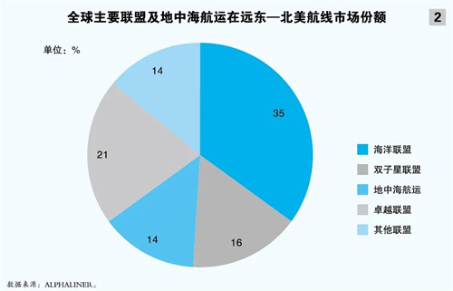 远东—北美航线的优势同样不容撼动。ALPHALINER的数据显示(见图2),目前海洋联盟占比达35%,排名第二的卓越联盟占比为21%,双子星联盟仅占16%。