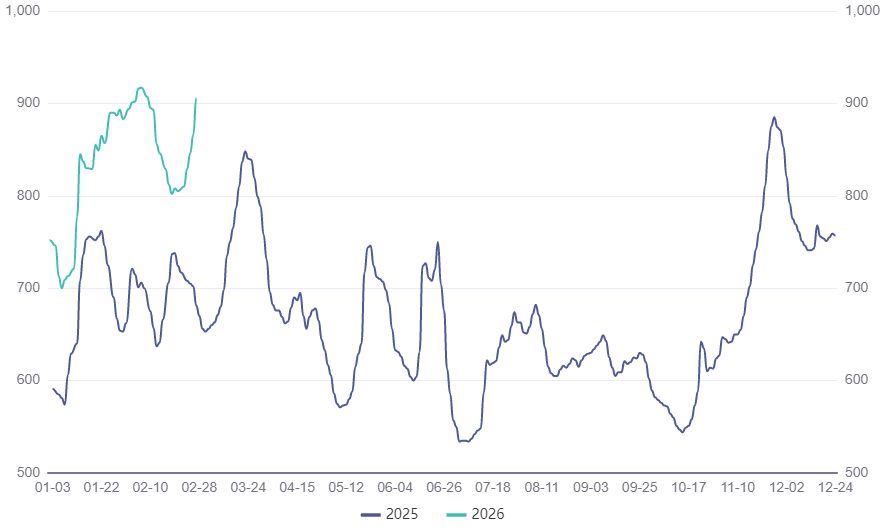 2026年02月27日,波罗的海成品油运费指数(Baltic Exchange Clean Tanker Index)收于906点(图2),全年最小值700点,最大值917点,中位数847.50点,平均值838.23点。相比2025年波罗的海成品油运费指数中位数656点(下降19.90%),平均值667.33点(下降18.42%);相比近5年(2021-2025年)波罗的海原油运费指数中位数702点(下降4.37%),平均值807.92点(下降15.64%)。