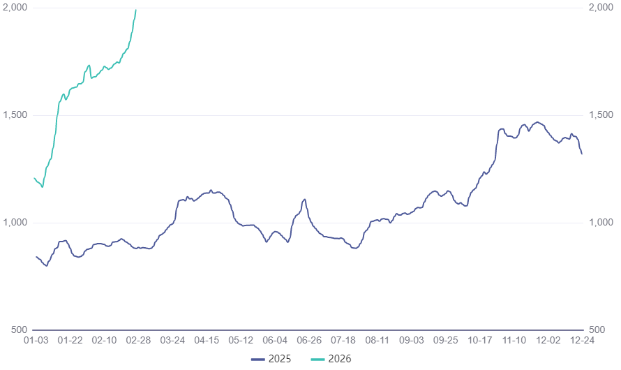 2026年02月27日,波罗的海原油运费指数(Baltic Exchange Dirty Tanker Index)收于1991点(图1),全年最小值1165点,最大值1991点,中位数1675点,平均值1617.38点。相比2025年波罗的海原油运费指数中位数1108